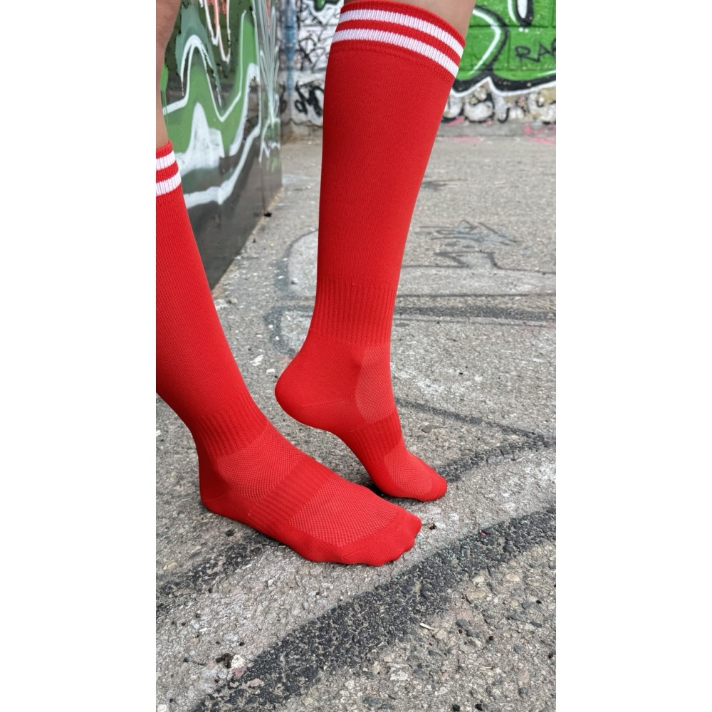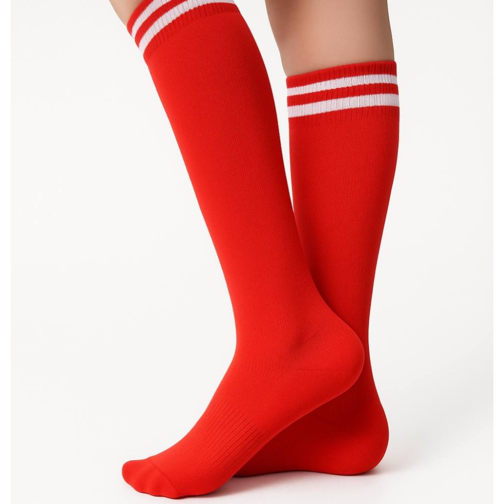 Технические характеристики Гольфы спортивные красные с белыми полосками до колена | Ростекс